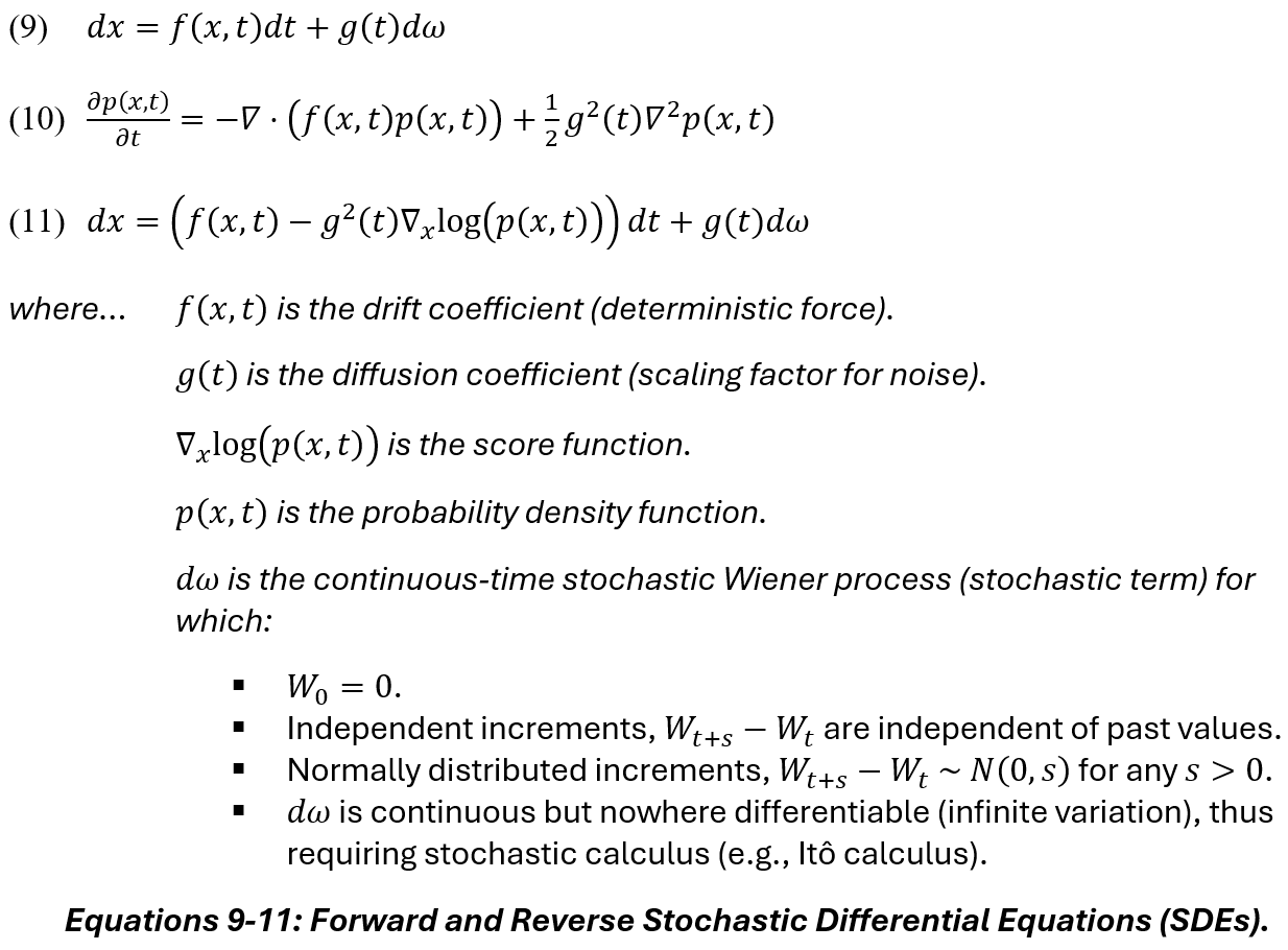 The DDPM motivated the formulation of the Markov chain as an Itô stochastic differential equation (SDE), expressed in general notation as (9). The process reversal can be expressed in terms of the (10) Fokker-Planck equation (FPE), which describes the evolution of the probability density p(x, t) over time via a velocity field (but does not directly describe individual sample paths). Notably, we cannot solve for p(x, t) directly, nor is the FPE immediately useful for reversing a stochastic process in its partial derivative form. The reasons behind this are discussed in greater detail in Section 5.5, Mathematical Stability.
