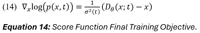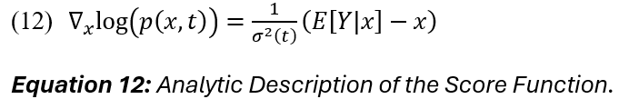 The score function estimates the clean signal based on the difference between the noisy signal x at time t and the clean signal Y. The method used to learn the score function is referred to as score matching. In score matching, the forward process of summing random Gaussian variables is equated to convolving their densities; this is helpful for formulating an analytic description of the score (12):