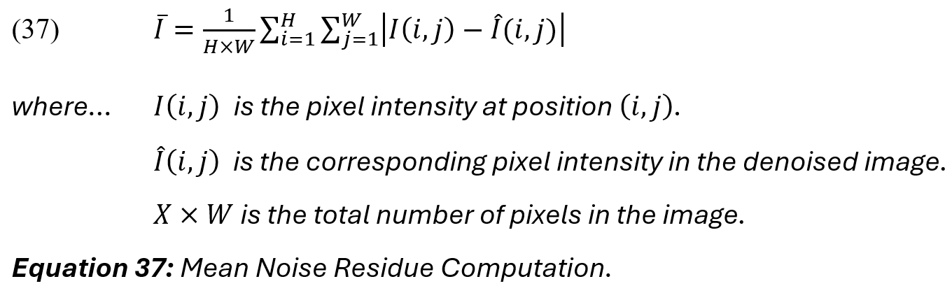 Figure 5b depicts an example of a noise residue analysis. Noise residue represents pixel-level random variations and refers to the remaining noise patterns in an image after applying a denoising process. As we have shown, noise addition and removal are instrumental to diffusion processes, but imperfect removal leads to residual noise, manifesting as subtle graininess or patterned distortions in the final output. The mean noise residue is calculated as the mean absolute difference between the original image [I] and its denoised version