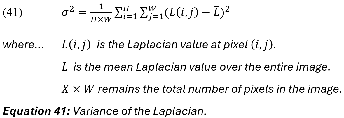 The variance of the Laplacian is computed as a quantitative sharpness metric, where a higher variance indicates sharper images that have well-defined edges, and lower variance indicates blurring, where hard lines and edges are less pronounced: