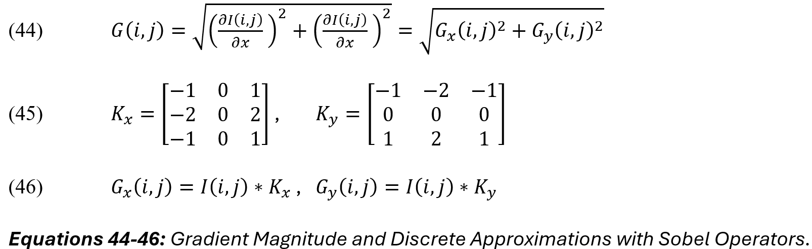 The gradient magnitude at each pixel (i, j) is given by the Euclidean norm of the gradient components. Recalling that images are discrete, we can approximate [G_x] and