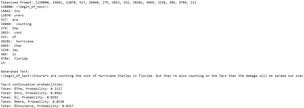 - Qualitative: Our bespoke qualitative measure required us to prompt the model with a short textual input (consistent with the theme of AGS News dataset) and inspect the generated continuation, allowing us to check the model’s semantic fluency, relevance, and alignment to the task (i.e., news genre classification based on short headlines/summaries). As part of our baseline assessment, we also extracted the top-k token continuation probabilities from the model’s final layer logits to understand its confidence distribution over vocabulary tokens.