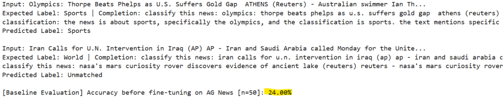 print(f"\n[Baseline Evaluation] Accuracy before fine-tuning on AG News [n={samples}]: {baseline_accuracy:.2%}")