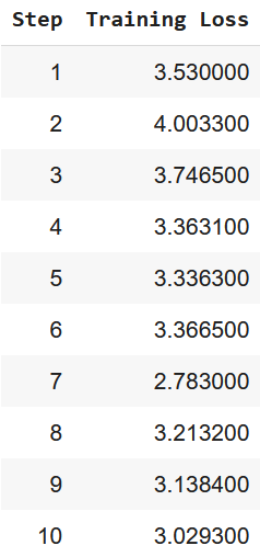 Post-fine-tuning results aligned with our expectations for this experiment’s task-specific training. Our training loss decreased from an initial 3.53 to 2.68 over 60 steps after one (LoRA) epoch.