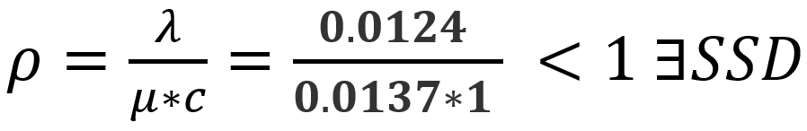 As I mentioned earlier, to have a steady state system we cannot have customers arriving at a rate greater than the rate at which they’re being served (otherwise the system gets backed up with customers). To test if this is the case for our observations, we use a handy formula referred to as the ‘traffic equation’. This traffic equation tells us whether or not the system is in steady state (i.e. if λ/μ < 1, then steady state exists). The traffic equation is represented as ρ (“rho”), a parameter referred to as the ‘traffic intensity’. When ρ < 1, we say that steady state exists.