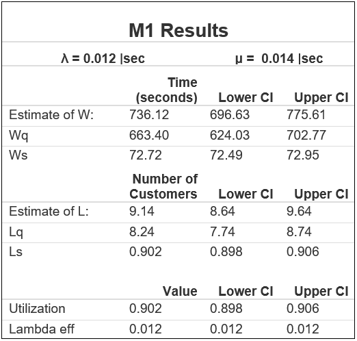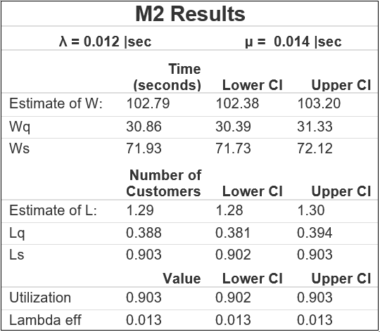 - Wq = Average time spent in the queue = 30.8 seconds (30.4, 31.3) 95% CI